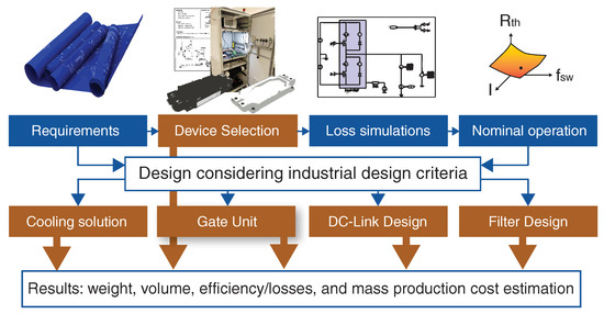 Then, nominal operation point and the previously defined converter requirements were used to design all the corresponding converter parts. Finally, all designed requirements were either matched with a part in the market (capacitors) or directly discussed with manufacturers (cooling system, power modules and filter inductors) to obtain a realistic design. These parameters were then summarized, and weight, volume, losses and cost analyses were performed. A summary of the methodology used in this design and corresponding comparison is shown in Figure 3.