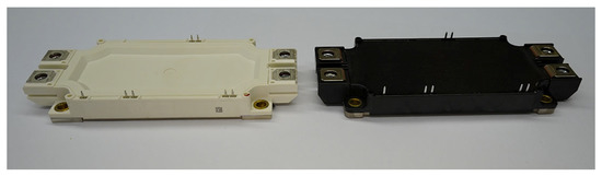 Selected half-bridge modules: (Left) (1700 V, 250 A) Infineon FF300R17ME4 (SI-IGBT + Si-Diode) [19]; and (Right) (1700 V, 250 A) Rohm BSM250D17P2E004 (SiC-Mosfet+SiC-SBD) [20].