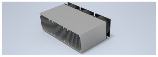 Heatsinks and fan-based air cooling are a widely distributed cooling solution in industrial converters, and hence this cooling solution was selected. However, due convection heat transfer, a simple calculation of the thermal resistance based on thickness and area is typically not possible, and high heatsink surface area usage is recommended [28] as typically the whole heatsink surface is heated up for its characterization. Several heatsinks were considered, but finally the forced cooling aggregated heatsink LA HL 3200 from Fischer Elektronik [29] was selected, as its thermal resistance was determined with smaller devices compared to the modules being considered (80 × 43), and hence the nominal datasheet parameters can be considered as a worst case scenario. A diagram of the corresponding heatsink can be found in Figure 6.