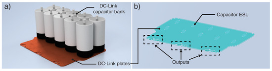 Finally, the DC-Link bus was designed with 2 mm thick copper bars isolated through a 0.25mm Hostaphan RN foil [35]. The DC-Link concept also features a small distance between the capacitor bank to the module connections, to homogenize the observed stray inductance from all module connections and distance itself from the heat sources. This space is however small, to not substantially increase stray inductance. Simulations with Altair Flux 2018 were performed to estimate the DC-Link stray inductance, from which an inductance of from every module connection was obtained. A summary of the DC-Link design and corresponding diagrams can be found in Table 5 and Figure 7, respectively.