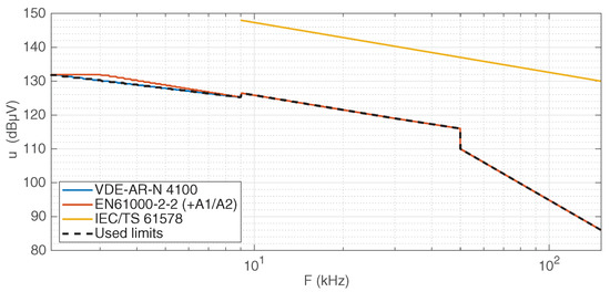 Comparison of grid code voltage limits for the frequency range of 9–150 kHz. For harmonic emission limits, VDE-AR-N 4100 and EN61000-2-2 were used.