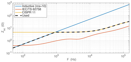 To calculate the voltage distortion at the PCC, the grid impedance has to be considered. The usual approach to assume a purely inductive grid would lead to bulky and expensive filters, which are not necessary in realistic grid applications. In the document CISPR11 [39], a network for harmonic emission measurement is defined. In the standard IEC/TS 62578, a grid impedance is proposed, which is based on measured grid data. Figure 9 shows a comparison of the different grid models. The network defined in [39] is not valid for low frequencies. Hence, a combined frequency dependent grid impedance model