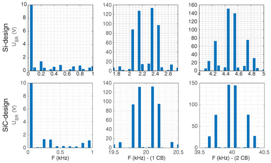 Worst-case harmonic spectrum of the low frequency harmonics and the two first carrier band frequency ranges for both the Si and SiC converter designs; (Top) Si-IGBT spectrum with kHz PWM frequency and 1 μs deadtime; and (Bottom) SiC-MOSFET spectrum with kHz PWM frequency and 0.5 μs deadtime.