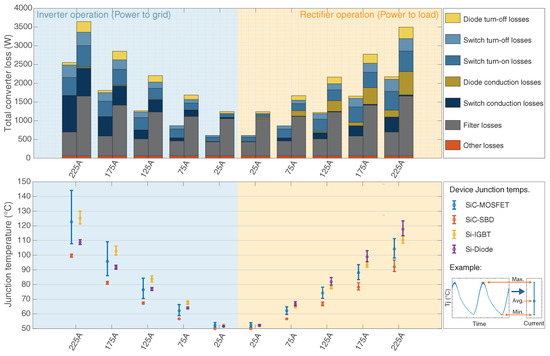 Converter loss distribution and junction temperature behavior for both designs in both modes of operation ( = [−1, 1] and M = 1.15) as a function of current. (Top) Converter loss distribution; SiC-MOSFET converter losses and Si-IGBT converter losses depicted in the left and right bar for every current, respectively. Other losses comprise gatedriver loss, heatsink fan loss and DC-Link loss. (Bottom) Junction temperature oscillations and average values for all devices in their respective modules; junction temperatures were adjusted to be displayed below their corresponding loss bars instead of over the current for better visibility.