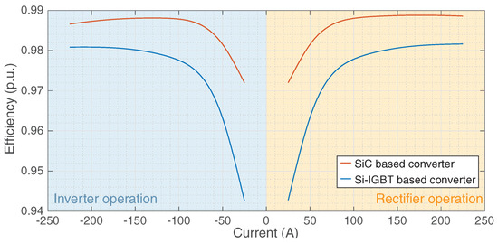When translating these losses into efficiency (see Figure 15), it can be observed that the SiC variant outperforms the Silicon based converter within the whole operation range, being also negatively affected by the filter for light loads, but presenting an overall behavior over 98% efficiency for almost the entire operation range. Furthermore, the current sharing of the MOSFET and diode in rectifier operation further reduces losses (see Figure 14), presenting an efficiency of 98.9% at nominal operation point. Regarding the Si-IGBT based design, the larger filter, the diode reverse recovery, the slower IGBT switching transients and the IGBT forward voltage drop characteristic are the main factors of reduced efficiency at light loads, performing better the closer is the device to reaching nominal operation with 98.3% efficiency at nominal rectifier operation.