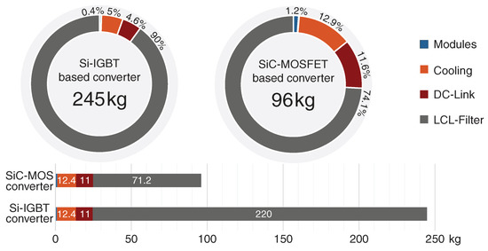 Considering the weight comparison analysis (see Figure 16), it is a known fact that a significant part of the converter weight is caused by the inductive line components (filter inductors and line transformer) because of their magnetic cores and the windings which are mainly composed of iron and copper in industrial converters. Hence, by raising the switching frequency almost tenfold, a significant reduction of the inductor weight by 68% is achievable assuming the harmonic limits in Figure 8. This heavily impacts the total weight of the converter, allowing a power density of 1.97 kVA/kg vs. 0.77 kVA/kg for the main components of the SiC-MOSFET and Si-IGBT converter, respectively.