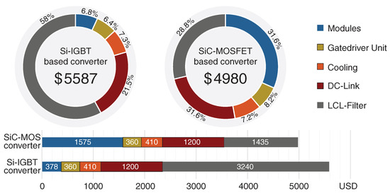 Finally, the cost distribution comparison of all converter components can be found in Figure 17. It is interesting that the sum of the considered component costs of the SiC-MOSFET converter is reduced by about 10% compared to that of the Si-IGBT converter. This cost difference is not substantial, and both designs share several design choices. The differences originate in the trade-off between module and filter costs. Here, due to the high share of the filter costs, the Si-IGBT-based converter components ends up being 10% more expensive than the SiC based-variant despite the lower semiconductor costs, showcasing the substantial impact of the filter on the overall design.