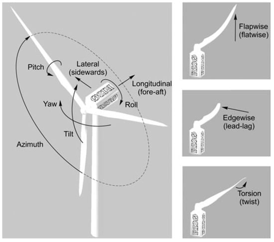 The wind turbine structure has several degrees of freedom; the tower can bend in the longitudinal and lateral directions; the nacelle and rotor can translate and rotate in tilt and roll, respectively; and bending of the blade can occur in flapwise (out-of-plan) or edgewise (in-plane) directions [14], as shown in Figure 2.
