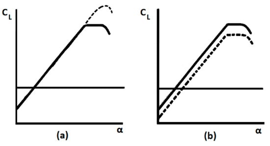 Figure 4. Effect of flow control devices on the airfoil lift curve. The solid line is the original airfoil; the dashed line is an airfoil with a device. (a) Delay stall devices and (b) camber modification devices [11]. - -
