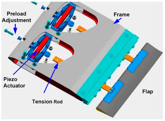 The concept of trailing edge flaps is to use a small movable surface to directly control the blade lift. The deployment of this surface on the pressure side increases the lift coefficient. On the contrary, the implementation on the suction side decreases the lift coefficient [8,9]. This technique was inspired by existing technology in aircraft and rotorcraft applications [27]. The first helicopter with blades equipped with piezoelectric driven trailing edge flaps (as shown in Figure 5) was tested at full scale in 2005, which demonstrated a remarkable vibration reduction in open and closed-loop mode [28]. There are several types of trailing edge flaps: