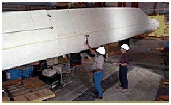 - Adaptive trailing edge geometry—this is a flap with no hinges, made of piezoelectric actuators attached to the main airfoil and shaped with soft foam to give them an aerodynamic shape. The foam is covered with skin to provide a smooth surface, as shown in Figure 7 [33]. Ferede et al. [34] accomplished an analytical study for the NREL 5 MW wind turbine, equipped with a camber morphing blade tip applied to the outer 30% of the blade span.This system reduced fatigue loads and blade tip displacement under different charges, applied according to IEC standards. Andersen et al. [35] investigated the optimal position of the flaps and the gauge sensor, in addition to the number of flaps applied to the NREL 5 MW wind turbine.Additionally, these flaps were experimentally tested [36] and were found to reduce up to 90% of the load. Moreover, its application to a full-scale Vestas V27 wind turbine, as shown in Figure 8, demonstrated an apparent load reduction, despite only 5% of the blade span being covered with an active trailing edge flap.