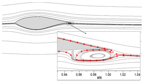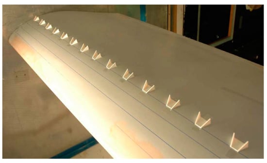 The optimal tab height and position, investigated in [43], were 1% of the chord located at x/c = 95% on the lower surface of the airfoil; the lift increased by 30–50%, both in numerical and experimental tests, with limited drag. Several studies, ranging from CFD simulations to wind tunnel experiments, demonstrated the effectiveness of these tabs in static and dynamic regimes [44]. Chow et al. [45] studied the efficiency of such a system in a transient regime, with a moderate change of angle of attack and varying deployment time. Mayda et al. [46] studied the effect of tab gaps on the aerodynamic load alleviation, using a 3D numerical model. They concluded that the addition of gaps reduced the drag induced by the full tab and ensured a compromise between lift and drag.