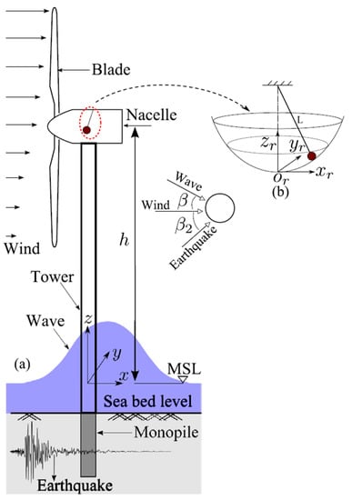 The tower vibration originates from the coupled wind–rotor–tower system, mechanical transmission twist vibration, and rotor rotation [15], resulting from the loads, as mentioned above. Additionally, the effect of the waves for offshore wind turbines should be considered
