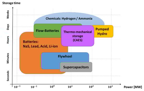 - Beaudin, M.; Zareipour, H.; Schellenberg, A.; Rosehart, W. Energy Storage for Mitigating the Variability of Renewable Electricity Sources. Energy Storage Smart Grids Plan. Oper. Renew. Var. Energy Resour. 2014, 14, 1–33. [Google Scholar]