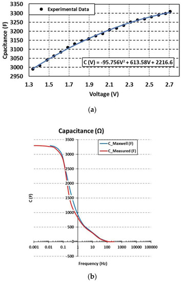 - The first and main feature is the capacitance. This parameter represents the energy storage behavior of the SCs, being a function of the voltage and the frequency [12]. This variation, shown in Figure 2a, is between 15% and 20% of the rated capacity [13]. This effect is important in ESS applications since the ESS operating voltage impose a capacitance value different to its rated value, which provokes less stored energy. Moreover, the operation frequency of the SCs modifies the capacitance value. Figure 2b shows that there is a cut-off frequency, usually around 1 Hz depending on the materials and manufacturing processes, where the rated capacitance drastically decreases. Therefore, SCs are usually considered for fast charge–discharge cycles, from tens of seconds to minutes.
