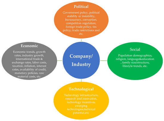 Framework and main contents of PEST analysis. Source: PEST analysis financial definition of PEST analysis (thefreedictionary.com (accessed on 16 May 2021)).