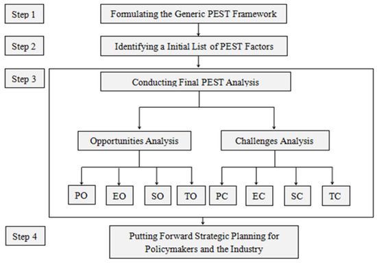 The research framework of the PEST analysis for exploring potential opportunities and challenges of solar PV power under carbon peak scenario in China was formulated based on work in [54,58]. It is composed of four steps, and the research flow is shown in Figure 2.