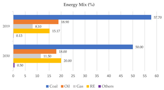 China’s energy mix by 2019 and estimated energy mix by 2030. Source: National Bureau of Statistics of China https://data.stats.gov.cn/english/easyquery.htm?cn=C01 (accessed on 20 April 2021).