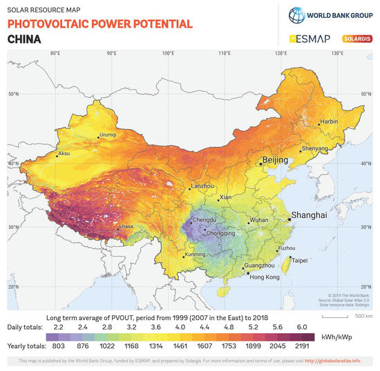 Solar PV power generation is based on the principle of the photovoltaic effect. The effect interprets that sunlight can be converted into direct current (DC) electricity through silicon-based semiconductors. According to application purposes, the DC electricity is converted into an alternating one through inverters [76]. Hence, the intensity of solar radiation is a precondition for developing solar PV power in any country or region. The Global Solar Atlas (version 2.0) shows that China’s annual solar radiation ranges from 968 kWh/m2 to 2117 kWh/m2, and the average radiation intensity is greater than 1485 kWh/m2 [77]. The potential theoretical yield performance of the PV array may become better when coupling ArcGIS and TRNSYS [78]. Figure 8 demonstrates the solar radiation resource across the whole of China. We can conclude that, except for Chongqing and Sichuan, most other regions are suitable for solar PV power. Furthermore, China has complex and diverse topographical conditions due to its vast territory. The northern areas, which are rich in land resources, are suitable for developing large-scale mounted ground solar PV power stations. Small and medium-sized grid-connected projects are prevalent in central areas such as Hebei and Shandong. In coastal provinces of Zhejiang and Jiangsu, the integration of fishery or agriculture to solar PV power is a terrific choice [79,80]. In the remote mountainous areas of Yunnan and Sichuan, self-consumption off-grid solar PV power systems are a perfect alternative [81].