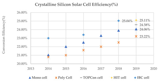 World record of conversion efficiency broken by Chinese solar PV companies (2013–2019). Source: Nation Renewable Energy Laboratory: https://www.nrel.gov/pv/cell-efficiency.html (accessed on 23 April 2021).