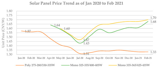 Price trend of solar PV panels from January 2020 to February 2021. Source: https://news.solarbe.com/202102/25/335122.html (accessed on 20 April 2020).