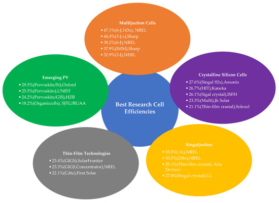 - NREL. Best Research-Cell Efficiency Chart. National Renewable Energy Laboratory of the UAS. Available online: https://www.nrel.gov/pv/cell-efficiency.html (accessed on 23 April 2021).