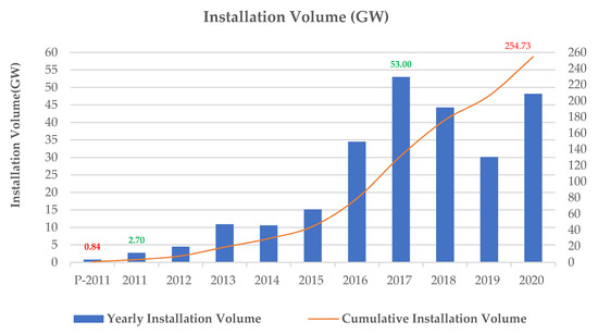 Solar PV power has experienced remarkable development in the past decade and has become the third-largest source of RE. Alongside wind power (733.28 GW), solar PV power (713.97 GW) has become a vital RE resource, second to hydropower (1739.88 GW), and has made significant contributions in meeting the increasing energy demand and in sustainable development globally [11]. Although the challenges and uncertainties that resulted in an economic slowdown due to the adverse effect of the COVID-19 pandemic, solar PV power has shown its tenacious vitality and gained positive growth. The newly installed capacity reached 126.84 GW (cumulative 713.97 GW) in 2020, a 29.27% growth compared with 2019. Among them, China accounted for the largest share of 49 GW (cumulative 254.35 GW), followed by the United States of America (USA), where the newly installed capacity was 14.89 GW (cumulative 75.57 GW). Vietmam performed beyond estimation and achieved an incremental installed volume of 11 GW (cumulative 16.50 GW). The European Union (EU) still experienced high growth that restarted from 2018, and the newly installed capacity was 18.78 GW (cumulative 152.92 GW). However, India encountered a sharp decline, and the newly installed capacity was merely 4.12 GW (cumulative 39.21 GW) compared with an incremental volume of 7.74 GW in 2019 [11] because India imposed extra customs duties on imported solar PV panels, which eroded the ever-robust solar PV market [12]. Upon review of the development of solar PV power globally, systematical incentive policies have been identified as the key factors that have triggered and accelerated the deployment progress. Each country’s approach is characterized by its customized policies [13]. Germany has taken the lead in formulating Political frameworks by revising the Renewable Energy Law in 2000 (EEG-2000) that guaranteed the rapid development of the solar PV power industry [14]. Germany has been a pioneer in the adoption of solar PV power for nearly ten years. The USA has implemented policies focused on Economic respects. National and state-level policies including the tax-refund scheme, soft loans, and other financial supports have made the USA ranked in the top three in the solar PV field [15]. The Fukushima nuclear accident in 2011 was a landmark Social event, which reignited Japanese enthusiasm about RE resources. The Japanese prefer solar to wind for eco-environmental reasons, and solar PV power is much more expensive. High feed-in tariff (FIT) rates (42 JPY/kWh), lower interest costs, and 100% acquisition of electricity generated by solar PV power plants by the grid companies have ensured a continuous motivation to develop solar PV power. Today, electricity generated by solar PV power plays a significant role in the Japanese energy mix [16]. India has heartened the development of solar PV power from Political and Economic views by promulgating the National Solar Mission strategy and has issued favorable FIT rates, long-term power purchase agreements (PPAs), and taxation preferences [17,18]. All these measures have activated India’s solar PV market, and the peak installation volume even reached 10 GW in 2018. As a latecomer in the field of solar PV power, China has realized the great significance and potential of solar PV power and has formulated comprehensive support for solar PV power from the perspectives of Political, Economic, and Technological factors. China enacted its Renewable Energy Law in 2006 and has issued favorable FIT rates [19,20]. In addition, China has granted taxation preferences and fiscal subsidies for R&D for the solar PV industry supply chain [21,22].