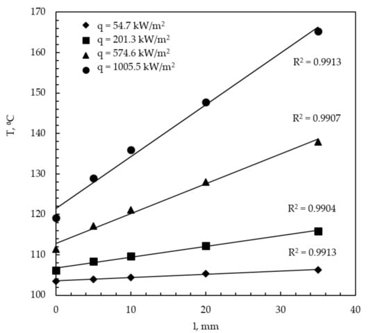 The linearity of the temperature values over a distance of 35 mm was examined and is presented in Figure 2. The coefficient of determination R2 = 0.99 suggested one-dimensional heat conduction at the top of the heating cylinder. The arrangement of thermocouples in the heating cylinder is shown in Figure 3a.