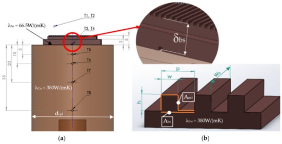 The diameter of the cylinder was dcyl = 45 mm, and the copper thermal conductivity was λCu = 380 W/(mK). A tin layer with a thickness of 0.1 mm (δSn) and a thermal conductivity of 66.5 W/mK (λSn) was used to attach the sample to the heating cylinder.