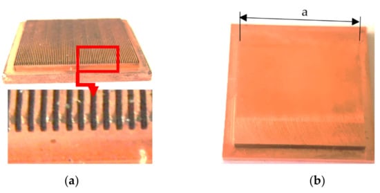 The surfaces with microchannels were made of copper and had parallel rectangular grooves made with an end mill (CNC machining process) (Figure 4a). The mean roughness was 0.123 μm. Tests were also carried out on a plain surface (Figure 4b) made of copper with a milling machine and polished with 600-grit sandpaper. The test section consisted of a 27 × 27 mm2 boiling region on a 32 × 32 mm2 square copper specimen. Table 2 compiles the surface codes and parameters of eleven MC surfaces according to the notations in Figure 3b.