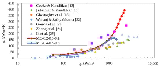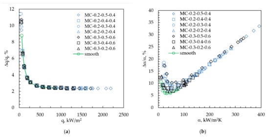 For the considered heat fluxes, the relative error varied between 11.4% and 2.3% for heat fluxes 50–2188 kW/m2 (Figure 5a), while the relative error of the heat transfer coefficient was between 5.8% and 33.5% for the range of 35–392 kW/m2K (Figure 5b). Similar results of relative error calculations were obtained by Kandlikar and coworkers in the paper [15].