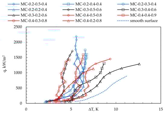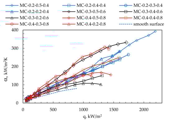 The measurement results for copper surfaces with microchannels are presented in the form of relationships α(q) (Figure 6) and q(ΔT) (Figure 7).