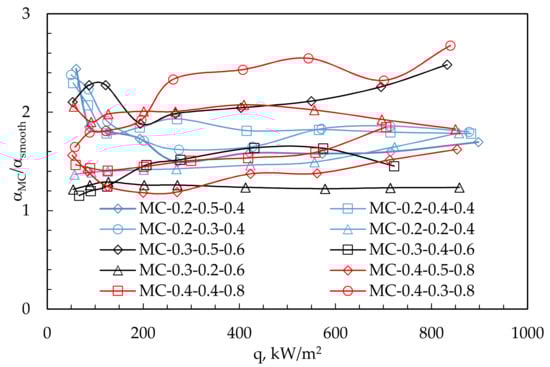Surfaces with microchannels with a width of 0.2 (MC-0.2-0.5-0.4) and 0.3 mm (MC-0.3-0.5-0.6) have the highest surface extension coefficients (Table 2, φ = 3.5 and φ = 2.67, respectively), which, with the efficiency of microfins η ranging from 0.85 to 0.99 [9], guarantees high effectiveness ε = φ η. Similar conclusions regarding the influence of the surface extension coefficient on HTC were presented by Cooke and Kandlikar [13].