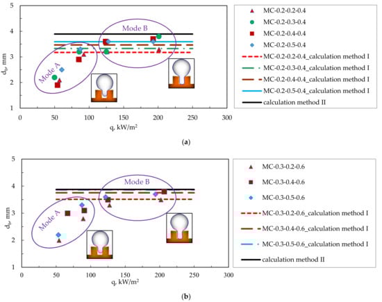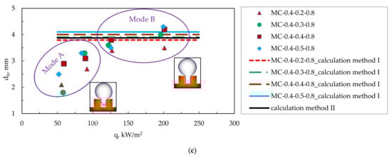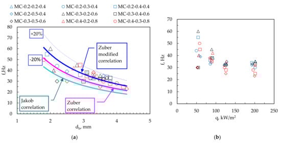 Relationships between the frequencies and diameters of departing bubbles are presented in Figure 10a. The experimental data were checked using the Zuber correlation [33]: