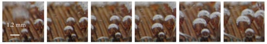 Another camera shot at an angle of 45° (Figure 14) to the tested surface allowed for a more accurate analysis of the bubble formation and growth cycle in the microchannel space.