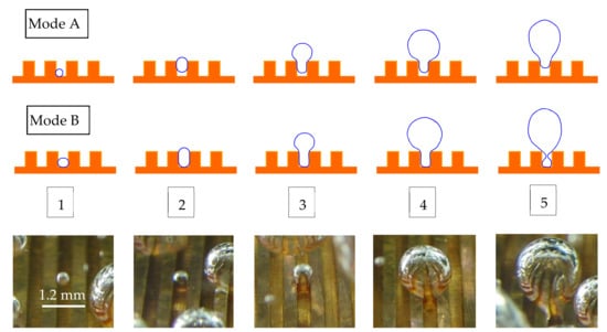 Bubble nucleation and growth in water at low and medium heat fluxes are shown in Figure 14. Analysis of the visualization images showed that the initial period of bubble growth is associated with its formation in a microchannel space limited by microfins. The observations made allowed us to distinguish between two modes (Mode A and Mode B) of nucleation, bubble growth, and departure. In the case of Mode A, which is characteristic of small heat flux, the microchannel spaces are almost filled with liquid and nucleation occurs in a corner near the bottom of the microchannel. The bubble expands to the width of the microchannel, then elongates and moves vertically, followed by the formation of the bubble above the microfin tips and an intense increase in the volume of the bubble, assuming a spherical shape above the microfin tip. At the same time, the volume of vapor filling the microchannel space decreases, resulting in an intense influx of liquid into the lower part of the microchannel, and the predominance of buoyancy force over the surface tension force results in the onset of the detachment period. A mechanism of bubble growth similar to the described one was presented by Walunj and Sathyabhama [22] in relation to a rectangular microchannel, distinguishing four phases of bubble growth: nucleation at the corner of the microchannel, growth in the channel, vertical bubble growth, and departure.