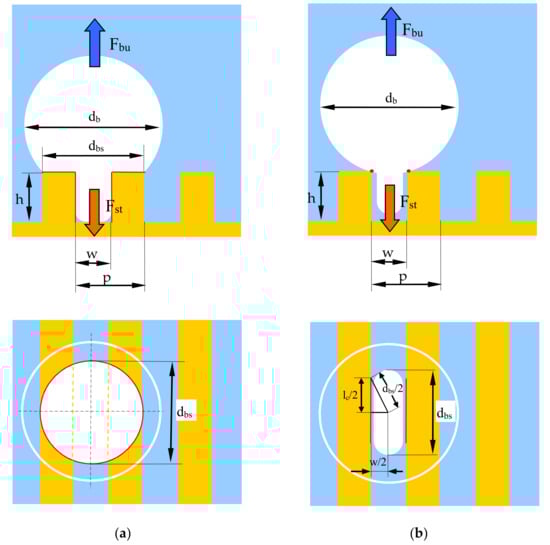 The bubble base diameter (dbs) was assumed to span two adjacent microfins, with the bubble in contact with their faces, lateral surfaces, and the bottom of the microchannel (Figure 15a). In determining the contact line by this method, the presence of liquid in the corners of the microchannel near the bottom is ignored. The length of the contact line can be calculated from the relationship:
