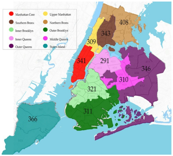 New York City is known for its significantly higher share of public transport use in the urban modal share and the lower private car ownership than other American cities. The share of public transport use (excluding taxicabs) for the work travels in New York City is 58.5% of travel works which is higher than many American cities [48]. The Metropolitan Transportation Authority (MTA) provides 2.62 billion trips by buses, subways, and railroads each year to New Yorkers, which is around one-third of mass transit users in the USA [49]. Moreover, New York City has a higher population density than many American cities, with 2028 inhabitants per hectare, which is around two times bigger than that of compact cities like San Francisco (955 inhabitants per hectare) [50]. The modal split for work travels among New Yorkers includes 46% use the subway and railroads, 27% use cars (including driving alone and carpooling), 11.5% take the buses, 8.5% walk, 1.6% taxis, and 1.1% ride their bicycle to work [48]. NYC Department of Transportation (2019) reported a significant increase in For-Hire Vehicle (FHV) trips by around 90% since 2010, which is related to the increase in the use of ridesourcing services like Uber and Lyft [51].