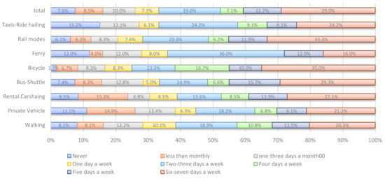 2175 out of 3346 participants in this survey replied to the question about the main mobility mode for their work trips including rail modes, ferry, bicycle, bus/shuttle, rental/carsharing, private vehicles, walking, and taxi/ride hailing. Figure 2 shows the frequency use of ATIS apps by participants who select each mobility mode as their main mode for work trips.