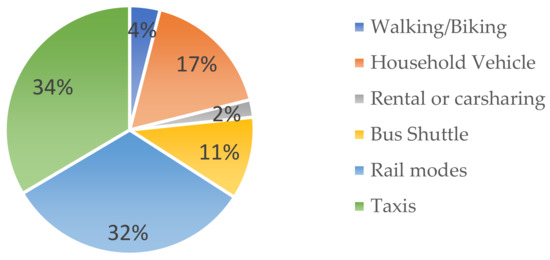 Ridesourcing is an ICT-based mobility mode, known as transportation network companies (TNCs), app-taxi, or ride-hailing, which connects passengers who request rides through smartphone-apps to their near available drivers by using GPS information and smart algorithms. The ridesourcing provides users real-time information about available drivers, waiting and travel time, different payment-methods, and rating systems, that passengers can assess the service quality of drivers [39]. Ridesourcing gained global successes in urban transportation by better service quality, more convenient door-to-door mobilities, and reasonable service fees than traditional urban transport modes like taxis. Some studies like in San Francisco indicated that ridesourcing services decrease deadheading distances compared to traditional taxis, which has a positive impact on energy efficiency and emission reduction [40]. Moreover, some studies mentioned that ridesourcing and online car-sharing might decrease household car ownership among citizens [41,42,43,44], which also positively impacts the sustainability of urban transport systems. Regarding the impact of ridesourcing on the mode choices of other sustainable modes like public transport, there are two effect-types, which are complementary and supplementary effects. The complementary impacts mean that citizens use ridesourcing integrated and connected with sustainable modes like public transport to fill temporal and spatial gaps in their infrastructure and service networks [45,46]. However, supplementary effects indicate that citizens replace sustainable modes with ridesourcing, which causes negative impacts on the sustainability of urban transportation by increasing vehicle-kilometers traveled (VKT), congestion volume, and consequently emissions [39,47]. The nonmotorized modes do not generate emissions, or public transport provides more energy-efficient and lower emissions by aggerating citizens’ travels than ridesourcing services, which are based on car travels. Therefore, the modal shift from these modes to ridesourcing among citizens might offset the energy efficiency and sustainable impacts of ridesourcing when some other citizens shift from their private cars or traditional taxis to ridesourcing. This paper studies the percentage of modal shift from different mobility modes to ridesourcing services like Uber, Lyft, Via, and Juno in New York, and it compares with the international findings of other related studies.