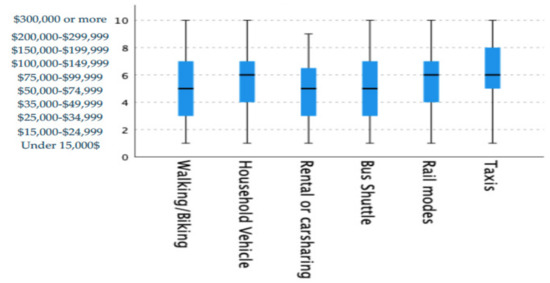 The results indicate that the most replaced mobility modes by ridesourcing services, including Uber, Lyft, Via, and Juno are taxis and rail modes by 34%, 32%, respectively. The private car is in the third place by 17%. The Kruskal-Wallis test is used to study whether there is a significant difference in the distribution of annual household incomes among citizens who replaced different mobility modes with ridesourcing services. Figure 4 illustrated the boxplot of annual household incomes per each replaced mobility mode by ridesourcing.