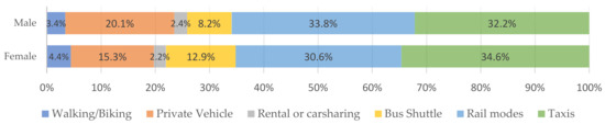 Furthermore, the other big different percentages of replaced modes by ridesourcing among men and women are private cars and bus/shuttles. Men and women reported that they had replaced private cars by ridesourcing by 20.1% and 15.3%, respectively. The percentage of men and women who replaced bus shuttles by ridesourcing are 8.2% and 12.9%, respectively.