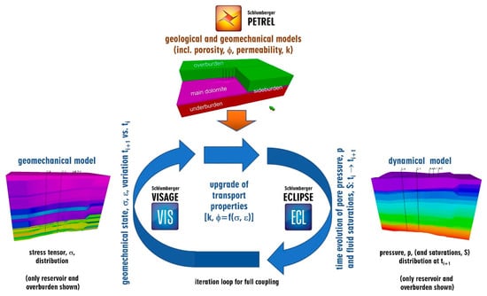 As a result of injection, the increased pressure of the fluid filling the pore space in the rock causes a change in the stress field. The disturbance of the stress equilibrium may lead to a potential risk of loss of tightness of the sealing rocks, creating a potential pathway for CO2 leakage to the overlying strata. To evaluate the tightness of the caprock, we employed numerical methods that combined geomechanic and reservoir fluid modelling of the reservoir and surrounding rocks using the Schlumberger software (Houston, TS, USA)—Petrel™ platform, VISAGE™ geomechanical simulator, and ECLIPSE™ reservoir simulator. The standard approach to this evaluation includes a two-way coupling of both types of simulations realised by iterative, alternating runs of the simulations, as shown schematically in Figure 2.