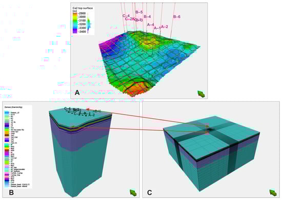 Visualisation of the model structures: (A)—3D model reservoir rock, (B)—3D structure including the over and underburden, (C)—the geometry of the final 3D grid used in the geomechanic simulator, including over-, under-, and side-burden.