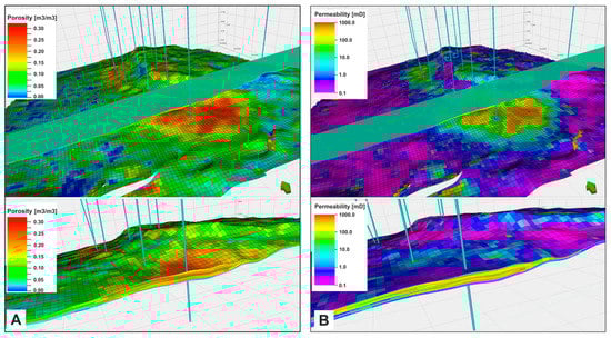 Visualization of the distribution of: (A)—porosity and (B)—permeability within the Ca2 main dolomite along the cross-sections of the central part of the 3D model within the target reservoir.