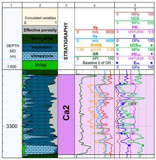 Graphic presentation of the input data and obtained 1D models of geomechanical parameters: track: 1—measured depth, 2—mineralogical model, 3—stratigraphy, 4—The input data include the compressional wave (vp), shear wave velocity (vs), density (RHOB), gamma ray (GR), 5—1D model of static uniaxial compressive strength (UCS), static Poisson’s ratio (PR), and static Young’s modulus (E).