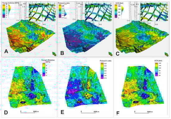 While calculating the spatial distribution of the geomechanical parameters, the truncated Gaussian simulation algorithm (TGS) with the Co-kriging option was employed, thereby allowing us to use the 3D seismic data as secondary data. The advantage of this approach is that it compensates for missing data and, therefore, unknown relationships, especially in the horizontal direction. As a result, we obtained 3D models of the geomechanical parameters, including the Young’s modulus, Poisson’s ratio, and UCS, in the main dolomite reservoir interval, as shown in Figure 7A–C, respectively. Moreover, in Figure 7D–F, the average values of the static Young’s modulus, Poisson’s ratio, and UCS in the reservoir zone, respectively, are shown.