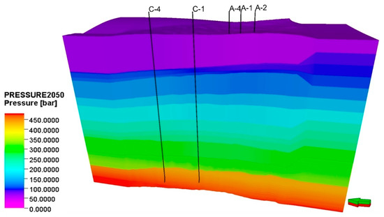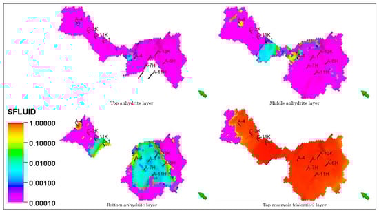 The horizontal resolution of the 3D grid was 100 m × 100 m. The vertical resolution of the model varied depending on the individual zones. To assess the overburden’s tightness, it was necessary to detail the zones that could play a key role in the possible leakage of the stored CO2, which included the rocks located in the vicinity of the main dolomite with minimal permeability. Accordingly, the highest resolution was used in the zones critical for further investigations, such as the reservoir rock (the main dolomite Ca2) and its closest sealing layer, the basal anhydrite (A2). The mean vertical resolutions in these intervals were 1.88 m and 4.85 m, respectively.