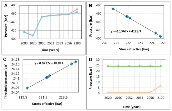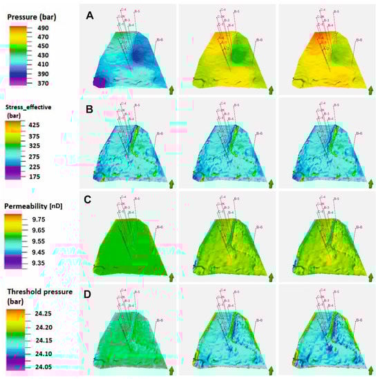 The developed 3D models of the geomechanical and petrophysical parameters were used as inputs to the geomechanical simulation. These were run for seven time steps (2003, 2020, 2050, 2052, 2053, 2056, and 2100) over the course of the hydrocarbon field exploitation and CO2 injection, which were defined by the distribution of the reservoir fluid pressure developed in the reservoir fluid flow modelling. The calculated stress field reflecting the geomechanical states of the analysed rocks at specific time steps were then used to evaluate the tightness of the caprock, which could potentially leak the injected and stored CO2.