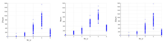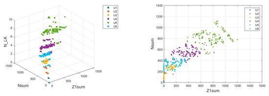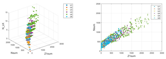 Figure 10 (these graphs show the values of Z1sum, Nsum and N_LK). These results largely overlap, and it is impossible to clearly define the boundaries of clusters [